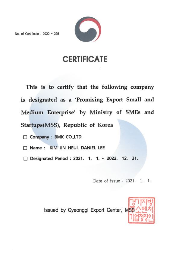 Promising Export Small and Medium Enterprise 페이지 정보 작성자 비엠케이 작성일21-01-22 10:56 조회3,077회 관련링크 이전글 다음글 목록 본문 'Promising Export Small and Medium Enterprise' by Ministry of SMEs and Startups(MSS), Republic of Korea 이전글 다음글 목록